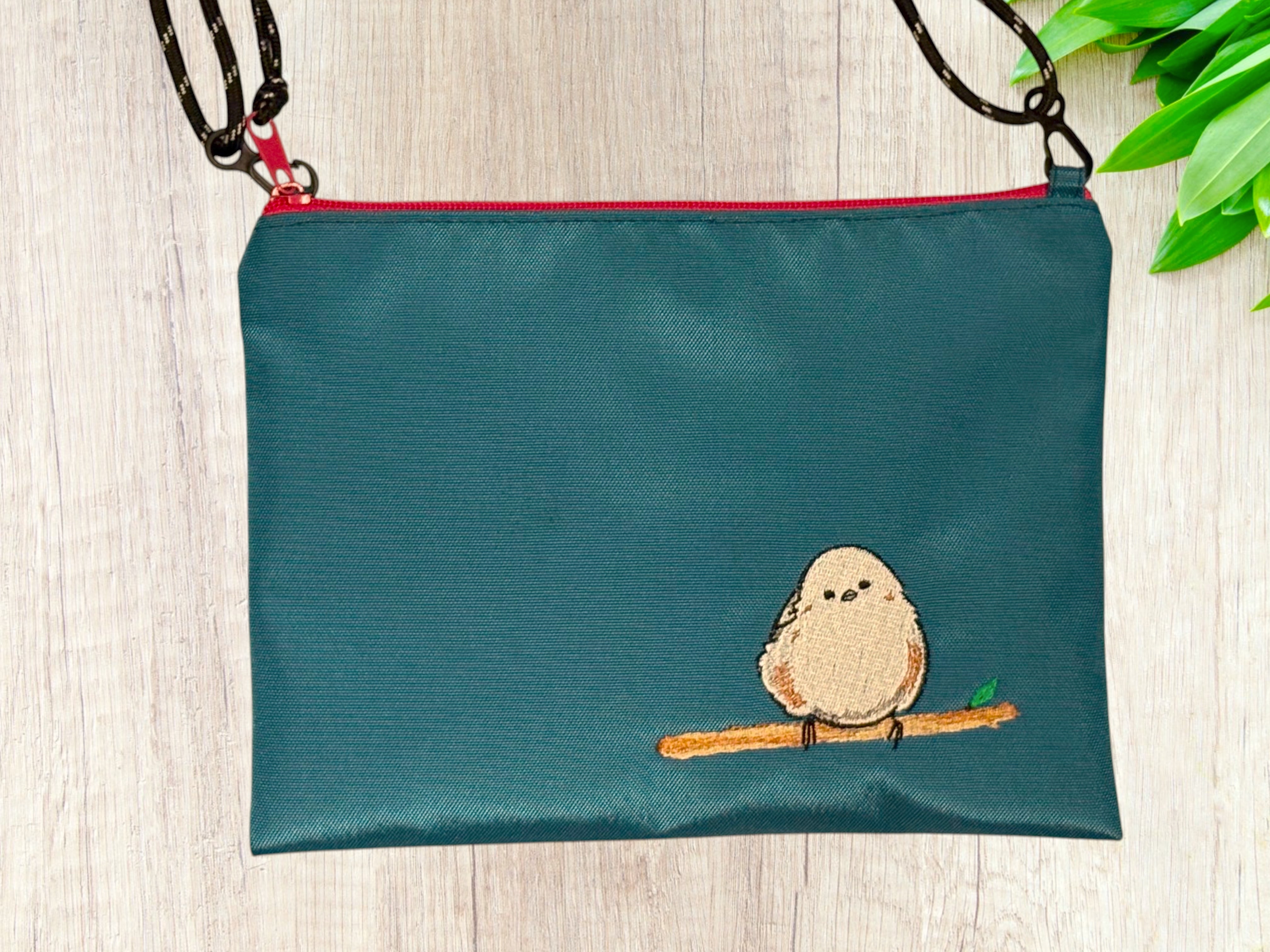 可憐なシマエナガを刺繍したサコッシュ&ポーチです。