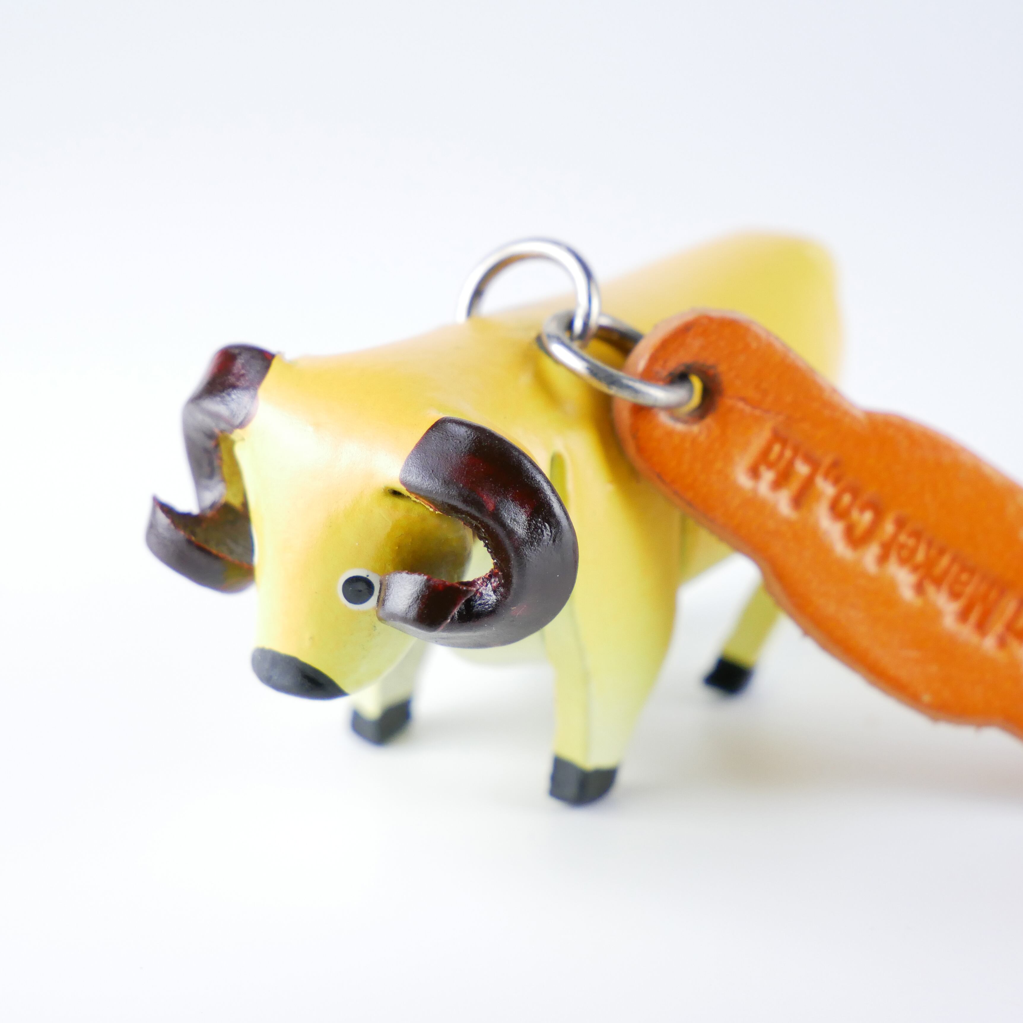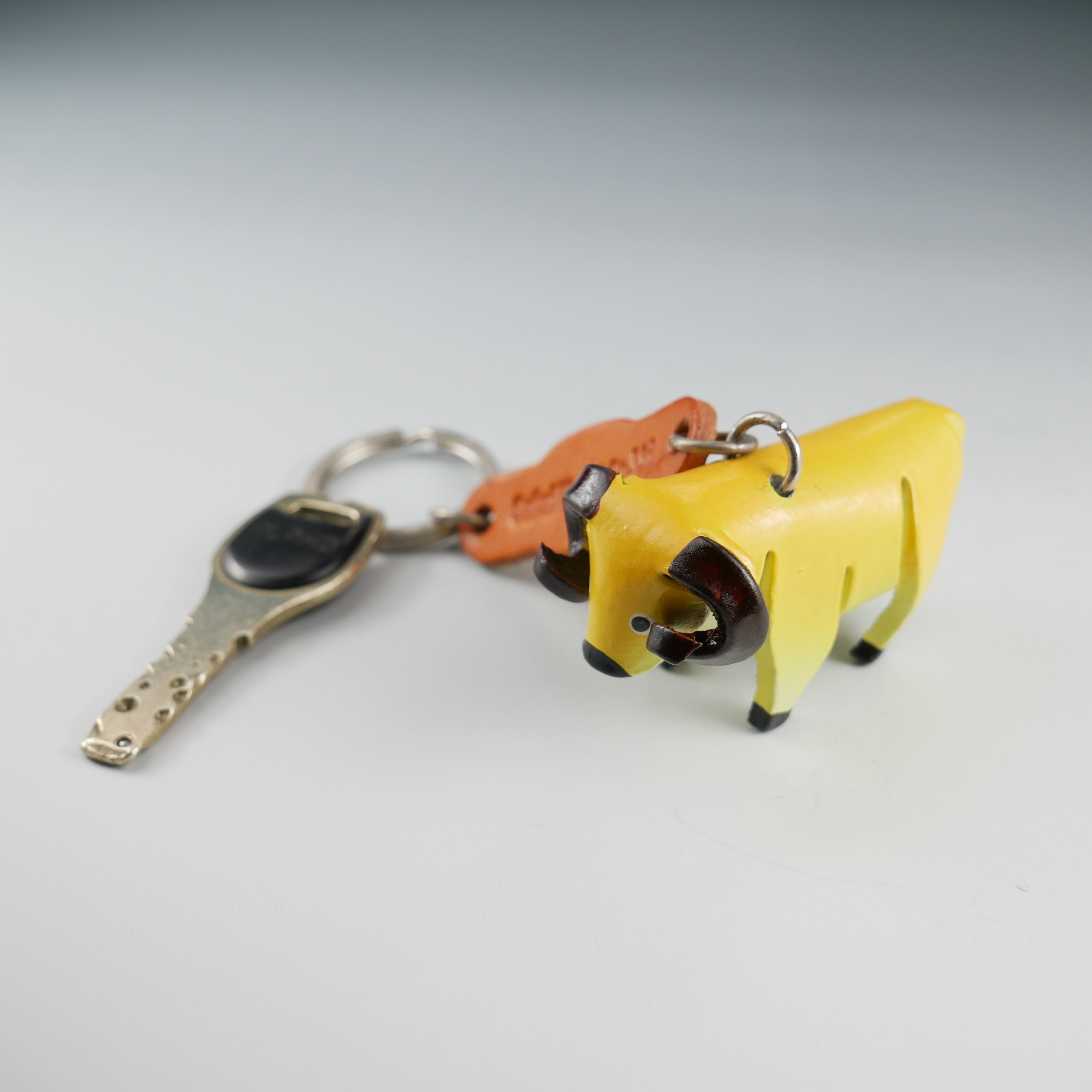 牛革を開いた状態でカットし、熱処理で成型し、手作業で彩色したキーホルダーです。 キーホルダーとしても、バッグのチャームとしても可愛いです。 素材 :牛革 サイズ:本体W7.0 x H4.0 レザープレートとリングの長さは約9cmです。 生産国:タイ